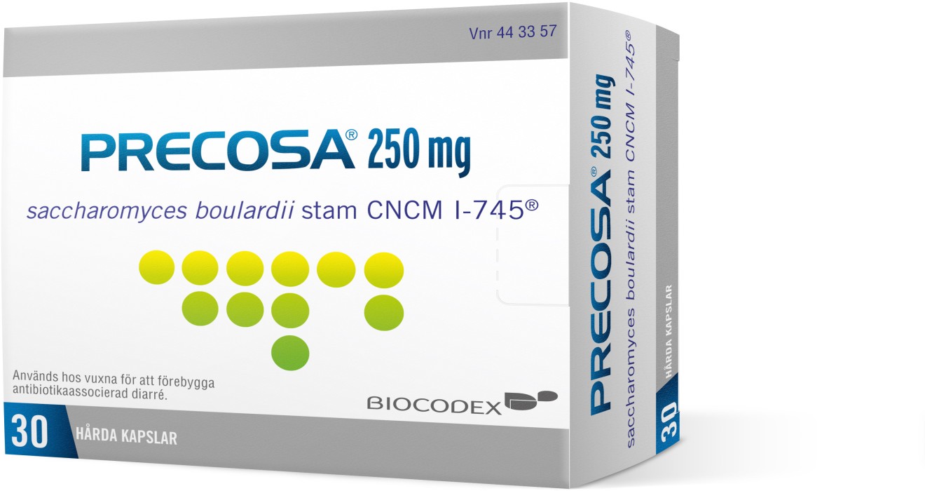 Precosa förhindrar aktiviteten av skadliga bakterier och virus som orsakar diarré. Den korrigerar även obalansen i mag-tarmkanalens bakterieflora. Precosa är det enda probiotiska läkemedlet med naturlig resistens mot antibiotika och kan därför tas samtidigt som antibiotikabehandlingen. Upp till 30% av befolkningen drabbas av diarré under antibiotikabehandling, och en stor majoritet av obalans i tarmfloran.