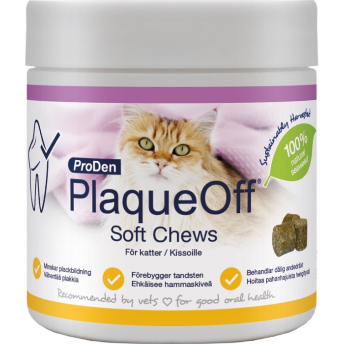 ProDen PlaqueOff Softchews för katt är mjuka tuggbitar med alger som kan minska plack och tandsten samt förbättra dålig andedräkt hos sällskapsdjur.