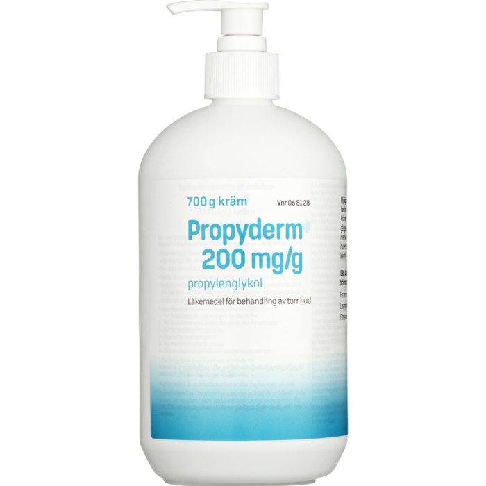 - Inga kända risker under graviditet. För att det ammande barnet inte i onödan ska exponeras för propylenglykol bör Propyderm inte smörjas på bröstvårtorna under amning.