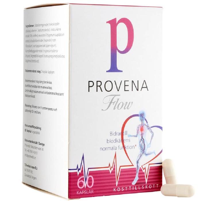 Provena Flow är ett kosttillskott som innehåller bland annat vitamin C, vindruvkärneextrakt, resveratrol och svartpepparextrakt. Vitamin C bidrar till normal kollagenbildning som har betydelse för blodkärlens normala funktion. Vegetabiliska kapslar.