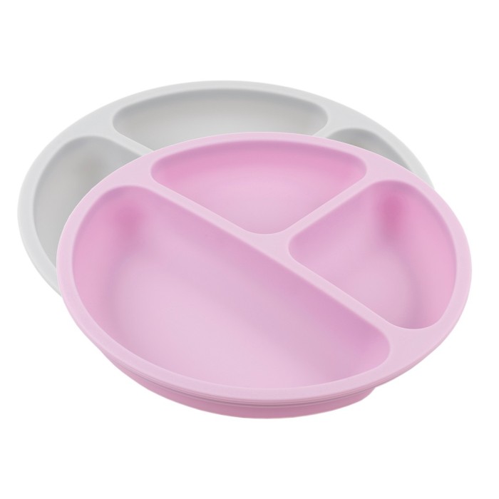 Ett 2-pack med mjuka barntallrikar i silikon, som tål att åka i golvet. I setet ingår två barntallrikar, en grå och en rosa. Tallrikarna är uppdelade i 3 fack, med två mindre fack och ett stort.