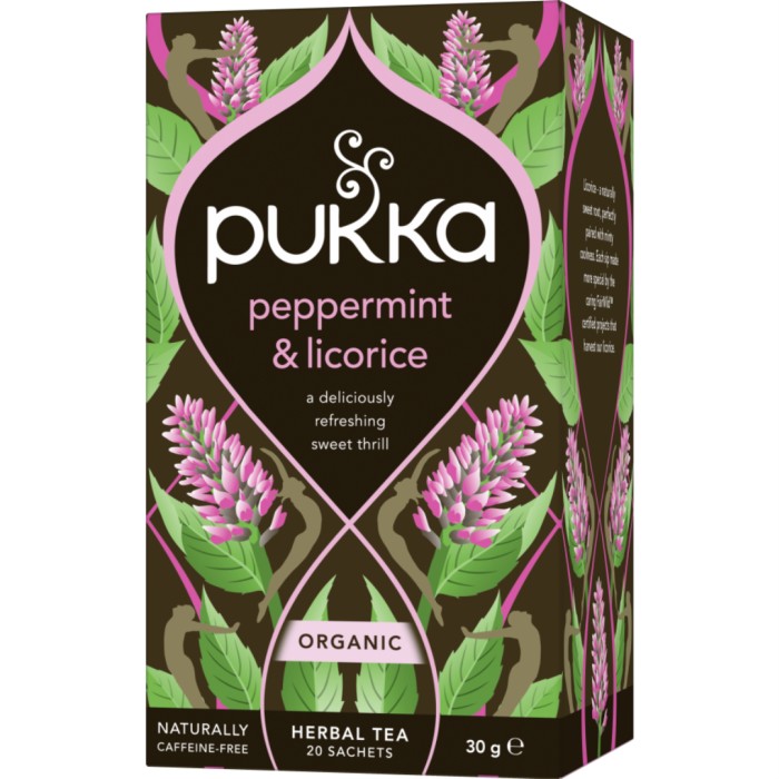 Pukka Peppermint & Licorice är ett uppfriskande och ekologiskt örtte. Med smak av frisk mynta och kryddig lakritsrot i en härlig blandning som passar perfekt att dricka både morgon och kväll.
