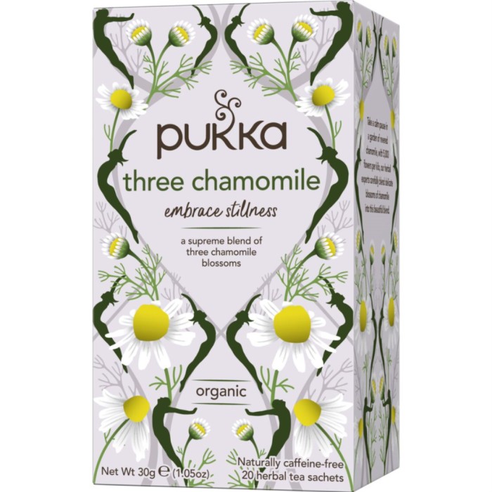 Pukka Three Chamomile är en te med en mix av tre typer av ekologisk kamomill. Ett örtte med karaktäristisk kamomillsmak.