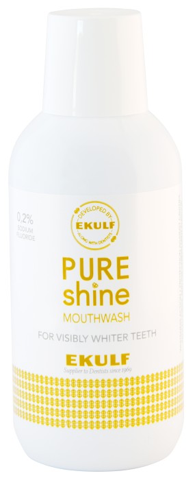 Ekulf Pure Shine Mouthwash är en munskölj med fluor och PVP (Polyvinylpyrrolidone) som motverkar beläggningar och plack på tänderna, för att på så sätt hjälpa tänderna att bibehålla sin naturliga färg. Pure Shine innehåller fluor (0,2% NaF) för att bidra till att remineralisera både emaljen och rotytan på tänderna och motverka karies och frätskador.