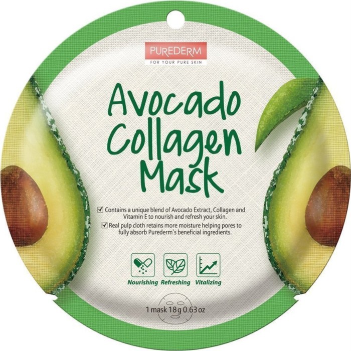 Purederm Avocado Collagen ansiktsmask innehåller en blandning av avokadoextrakt, kollagen och E-vitamin för att ge näring och vitalitet till din hud. Masken innehåller äkta avokadoextrakt och hjälper till att vitalisera huden. Den naturliga massaduken bibehåller mer fukt än ett syntetmaterial, vilket hjälper porerna att absorbera maskens ingredienser.