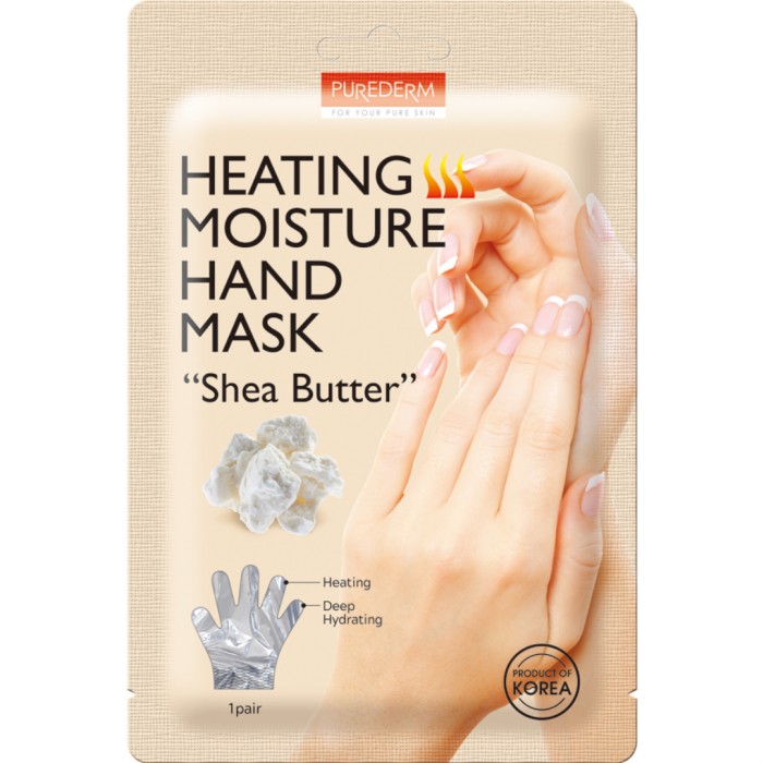 Purederm Heating Moisture Hand Mask är en uppvärmande och återfuktande mask för händerna. Masken använder en kombination av ett uppvärmande tvåskiktstyg och en speciell formulering som har en djupt återfuktande effekt och en värmande känsla. Sheasmör skapar en fuktgivande barriär på huden så att huden jämnas ut.