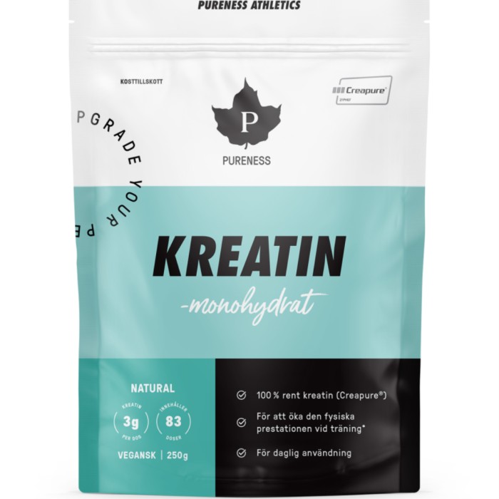 Pureness Athletics Kreatin Creapure 100% rent kreatin i pulverform. Framtagen för vuxna som utövar högintensiv träning. Pulvret innehåller kreatinmonohydrat Creapure®, som anses vara ett av världens renaste kreatin. Renheten säkerställs i flera steg av produktionen. Att ta kreatin dagligen kan stödja effekterna av styrketräning vid högintensiv träning. Den gynnsamma effekten av kreatin uppnås vid ett dagligt intag av 3 g kreatin. Vegansk.