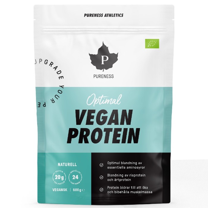 Pureness ekologiska proteinpulver Optimal Vegan Protein är ett högkvalitativt vegetabiliskt protein med 80% protein, framställt genom att blanda fullkornsrisprotein och ärtprotein. Risprotein är i sig ett växtprotein med nästan komplett aminosyraprofil, men ris har dock låga halter av den essentiella aminosyran lysin. Lysin, å andra sidan, finns rikligt i baljväxter såsom ärter. Att kombinera dessa två proteinkällor ger en välbalanserad aminosyrakomposition som är ett alternativ till proteinpulver från animaliska källor.