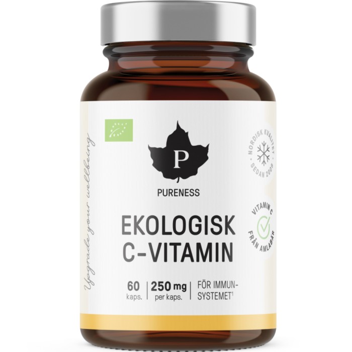 Pureness Ekologisk C-Vitamin innehåller vitamin C extraherat från amlabär. Vitamin C bidrar till immunsystemets normala funktion under och efter intensiv fysisk träning. C-vitamin bidrar även till normal kollagen-bildning som har betydelse för blodkärlens, benstommens, broskets och hudens normala funktion. Vitamin C bidrar också till nervsystemets normala funktion och till normal energiomsättning. Vegansk.