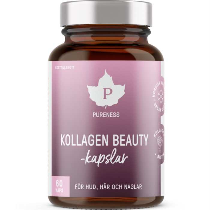 Pureness Kollagen Beauty är ett kosttillskott som kombinerar Verisol® kollagenpeptider, C-vitamin, tre sorters zink och biotin. Vitamin C bidrar till normal kollagenbildning som har betydelse för hudens normala funktion. Biotin bidrar till att bibehålla normal hud och normalt hår. Zink bidrar till att bibehålla normala naglar.
