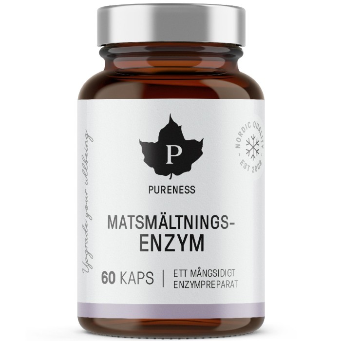 Pureness Matsmältningsenzym är ett enzympreparat som innehåller tolv utvalda enzymstammar bl.a. amylas, proteas, lipas, laktas och cellulas. Matsmältningsenzymer omvandlar mat till näring genom att bryta ner kolhydrater, protein och fett i kroppen. Tekniken som använts för att framställa kapslarna gör det möjligt för enzymerna att behålla sin funktion i en mycket sur miljö och i en mycket alkalisk miljö. Ta en kapsel och skölj ned den med vatten innan måltid.