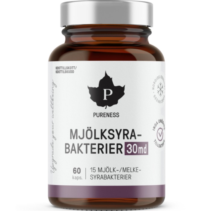 Pureness Mjölksyrabakterier är ett kosttillskott där varje kapsel innehåller 30 miljarder mjölksyrabakterier från 15 bakteriestammar. Detta kosttillskott innehåller även inulin och frukto-oligosackarider. Lämplig för daglig användning eller att ta under en kortare period vid behov.