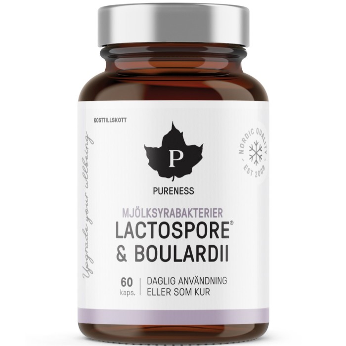 Pureness mjölksyrabakterier med boulardiijäst är ett kosttillskott som innehåller LactoSpore®, en så kallad sporformad mjölksyrabakterie samt Lynside® boulardii, en jäst av en noggrant forskad och patenterad stam.