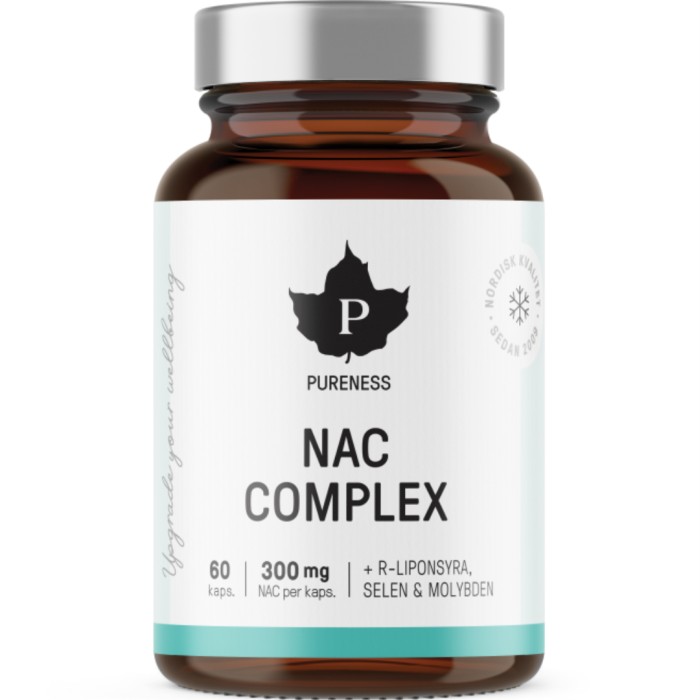 Pureness NAC Complex är ett kosttillskott som innehåller N-acetyl-L-cystein (NAC) samt aktiv R-liponsyra, selen och molybden.
