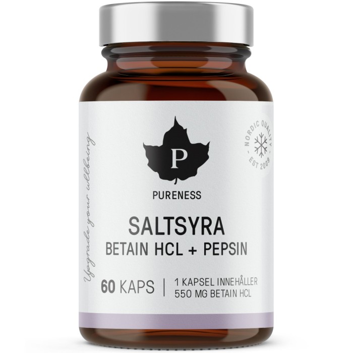 Pureness Saltsyra Betain HCL + Pepsin är ett näringstillskott vars innehåll av betain bidrar till normal homocysteinomsättning vid ett dagligt intag av 1,5 g betain. Ingredienserna i Pureness Saltsyra är saltsyra bunden till betain, pepsin och gullgentiana. Magsäcken behöver tillräckligt med saltsyra för matsmältning, intag av näringsämnen och pepsinenzym för att spjälka proteiner.