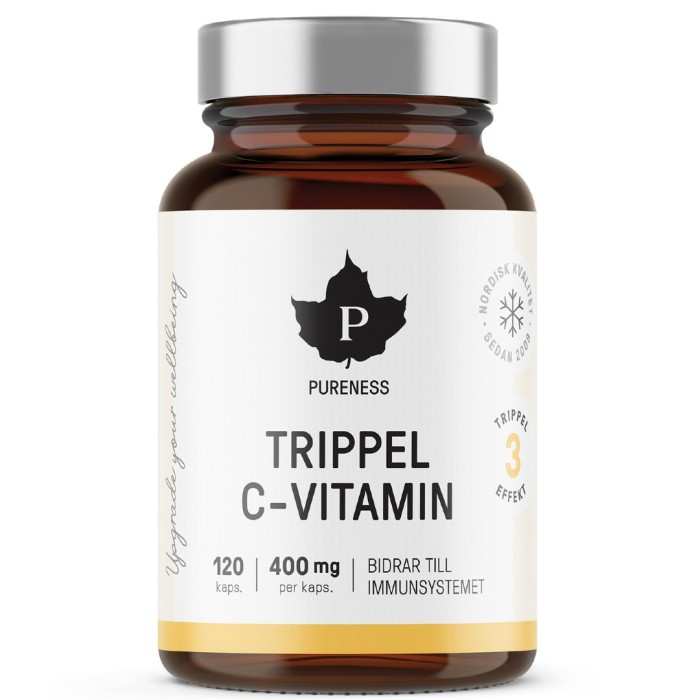 Pureness Trippel C-vitamin är ett kosttillskott som kombinerar tre effektiva former av C-vitamin med Camu Camu-bärpulver och citrusbioflavonoider. Camu Camu-bäret växer i Sydamerikas regnskogar och är rikt på C-vitamin och andra bioaktiva ämnen.