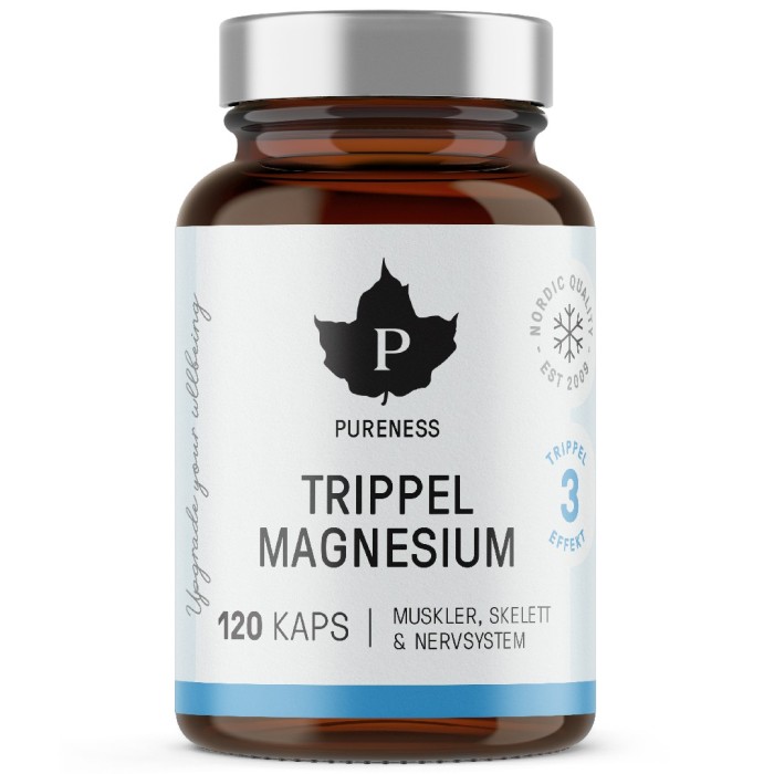 Trippel Magnesium från Pureness är ett kosttillskott som innehåller tre former av magnesium av högsta kvalitet: magnesiummalat, magnesiumglycinat och magnesiumtaurat. Kapselhöljet är gjort på bara cellulosa och vatten.
