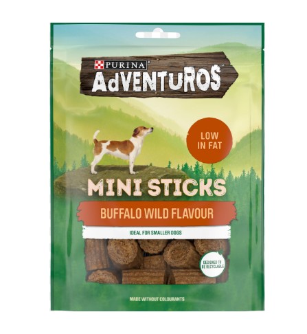 Purina Adventuros Mini Sticks Buffalo är snacksticks med smak av buffel utvecklade för små hundar. Sticksen är hårda på utsidan, mjuka på insidan och fulla av god smak för hunden.