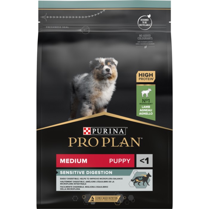 PURINA® PRO PLAN® DOG Medium Puppy Sensitive Digestion är ett komplett torrfoder för medelstora hundvalpar. Fodret är rikt på lamm och innehåller OPTIDIGEST® som är en kombination av balanserade näringsämnen som stödjer känslig matsmältning. Även lämpligt för dräktiga eller digivande tikar.