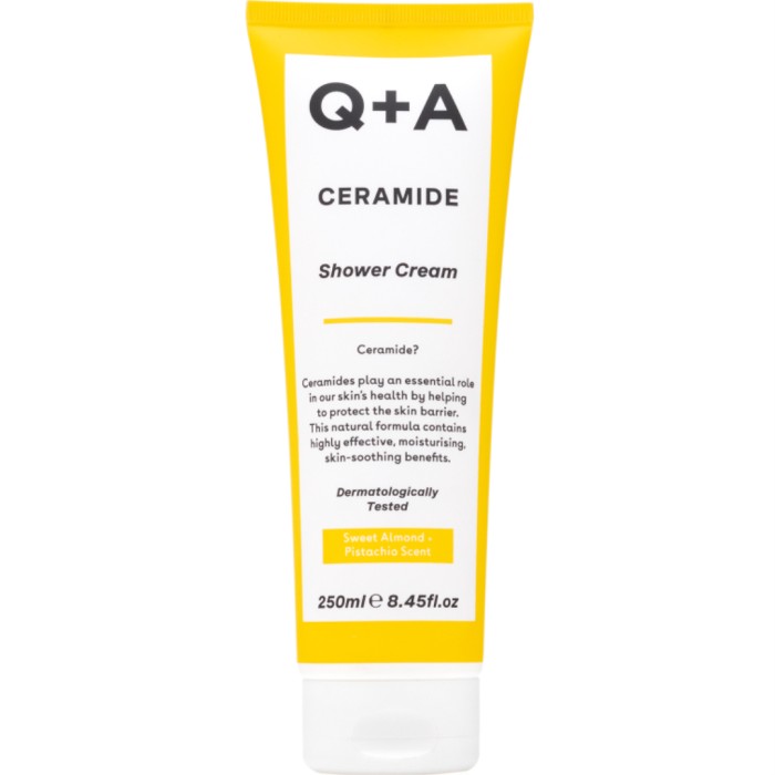 Q+A Ceramide Shower Cream är en duschkräm med ceramider som återfuktar och skonsamt rengör huden, och har en rik och krämig formulering. Ceramide Shower Cream har en söt doft av mandel och pistage och innehåller ytaktiva ämnen som är milda mot huden.