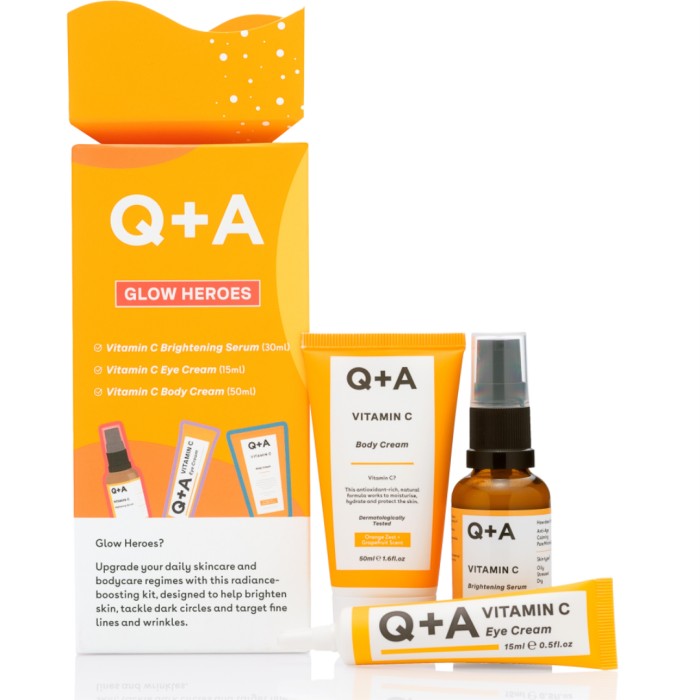 Q+A Glow Heroes Gift Set är ett presentset med hudvård som innehåller den populära ingrediensen C-vitamin för att ge huden lyster. C-vitamin är rik på antioxidanter som skyddar huden och bidrar till en jämnare hudton och en fräsch lyster. Detta presentkit innehåller ansiktsserum, ögonkräm och kroppskräm.