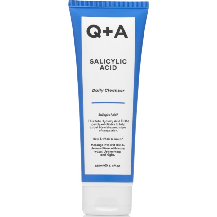 Q+A Salicylic Acid Daily Cleanser är en ansiktsrengöring som skonsamt tar bort orenheter från huden och rengör tilltäppta porer. Salicylic Acid Daily Cleanser bevarar den naturliga oljebalansen i huden och stör inte hudbarriären. Rengöringen är berikad med salicylsyra, exfolierar huden och hjälper till att göra porerna mindre synliga. Med en kombination av allantoin för att lugna huden, och betain för att bibehålla fukt och förhindra torrhet, är detta en ansiktsrengöring som kan användas dagligen för att hålla huden mjuk och fräsch.