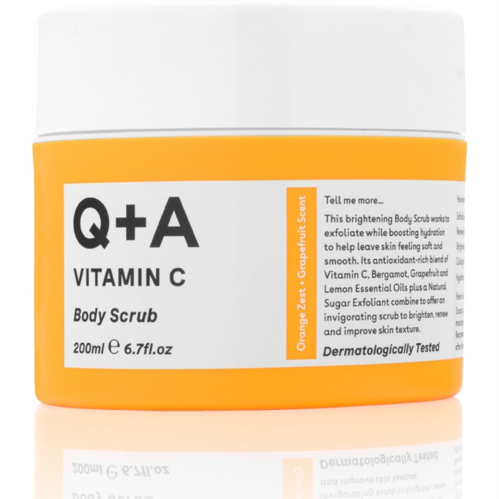 Q+A kroppsskrubb innehåller vitamin C med antioxidanter som hjälper till att skydda mot fria radikaler. Den stimulerar även hudens egen cellförnyelse för att ha anti-aging-fördelar. Vitamin C hjälper huden att behålla mer fukt än normalt, vilket hjälper till att ge en fräsch lyster. Innehåller eteriska citrusoljor med höga antioxidantinnehåll som hjälper till att skydda huden mot fria radikaler, och bidrar till en jämn lyster. Magnesiumsalt och socker ger en effektiv exfoliering av döda hudceller.