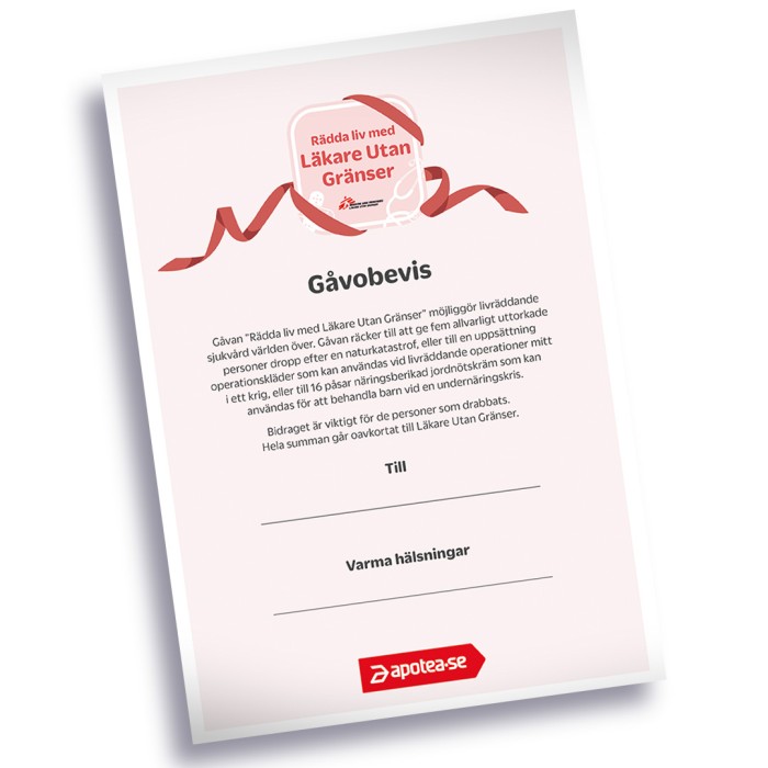 Genom att köpa Rädda liv med Läkare Utan Gränser bidrar du till livräddande sjukvård världen över. Gåvan räcker till att ge fem allvarligt uttorkade personer dropp efter en naturkatastrof, eller till en uppsättning operationskläder som kan användas vid livräddande operationer mitt i ett krig, eller till 16 påsar näringsberikad jordnötskräm som kan användas för att behandla undernärda barn vid en undernäringskris.