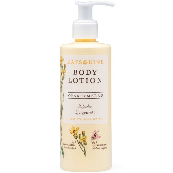 Rapsodine bodylotion oparfymerad är en dryg bodylotion som lätt absorberas av huden och lämnar en sammetslen känsla. Rapsodines lotion baseras på svensk ekologisk rapsolja som är rik på vitamin E och har en lång fuktighetsbevarande effekt. Lotionen innehåller även extrakt från ljung som bidrar till att bevara hudens elasticitet.