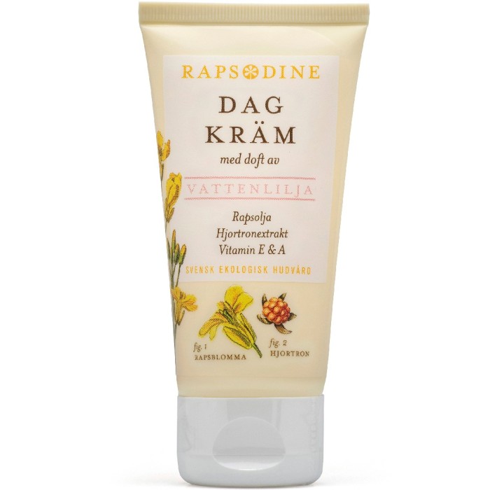 Rapsodine dagkräm är en näringsrik ansiktskräm som återfuktar och bevarar hudens smidighet. Krämen innehåller ekologisk rapsolja, extrakt från hjortron samt vitamin E och A.
