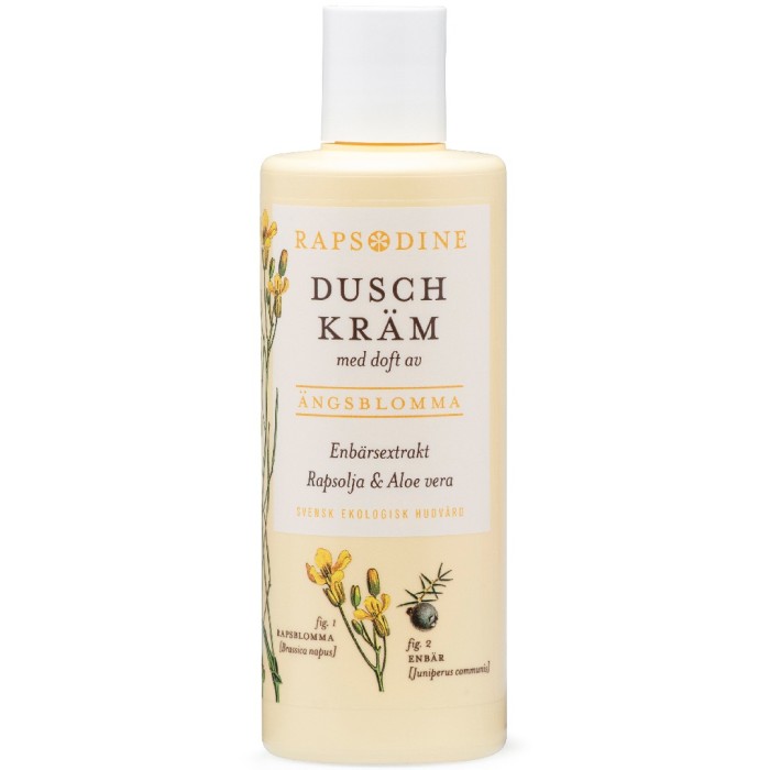 Rapsodines duschkräm innehåller svensk ekologisk rapsolja som hjälper till att återfukta huden.