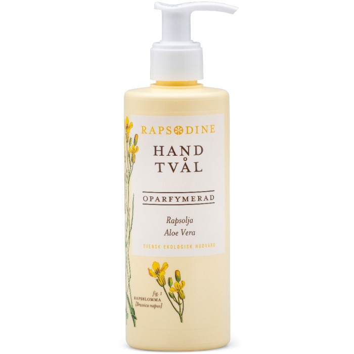 Rapsodine flytande tvål är en oparfymerad tvål som är dryg, skonsam och verkar inte uttorkande på huden. Tvålen innehåller svensk ekologisk rapsolja som har återfuktande egenskaper.