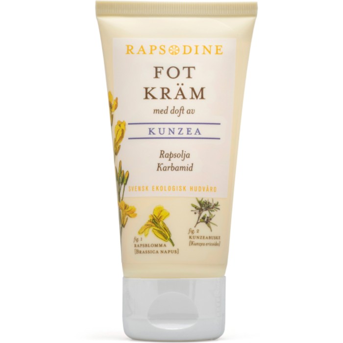 Rapsodine fotkräm är baserad på ekologisk rapsolja som mjukgör hård och torr hud. Fotkrämen skyddar och förebygger att huden torkas ut. Rapsodine fotkräm innehåller även karbamid och eterisk olja från Kunzea-busken. Krämen kan med fördel användas på torr och hård hud.