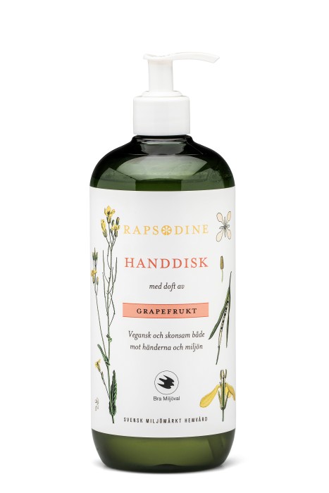 Rapsodine Handdisk är ett diskmedel märkt med Bra Miljöval. Diskmedlet innehåller rapssåpa och uppfyller krav på biologisk nedbrytbarhet. Rapsodine diskmedel har en dryg formulering och mycket goda fett och smutslösande egenskaper. Doft av grapefrukt.