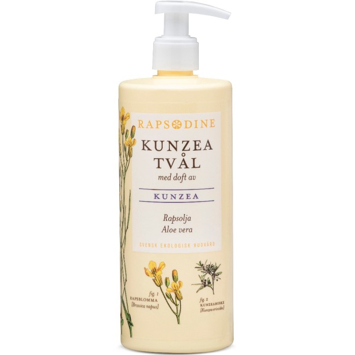 Rapsodine Kunzeatvål är en dryg skonsam och fuktighetsbevarande tvål som innehåller svensk ekologisk rapsolja samt Kunzeaolja. Kunzean växer endast längs med kusten i Tasmanien i södra Australien och har en lindrande effekt på många hudåkommor. Tvålen är lämplig som handtvål till mycket torr och irriterad hud. Tvålen är mild och kan även användas till hy med blemmor.