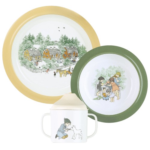 En barnservis i tre delar från Rätt Start, med tryck från Barnen i Bullerbyn. Servisen innehåller en pipmugg, en djup och en flat tallrik. Pipmuggen har två handtag och locket sitter ordentligt med hjälp utav en silikonring. I pipen finns ett spillstopp som begränsar flödet, som man kan ta bort när barnet blir äldre. Tallrikarna har silikonring undertill som gör att de står stadigt på bordet.