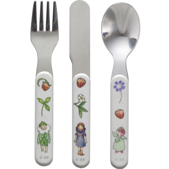 Beskow Blomsterbarn tåliga barnbestick i tre delar. Besticken är tillverkade i ABS-plast och rostfritt stål. Kniv, gaffel och sked som passar små händer och munnar. Levereras i en fin presentkartong.