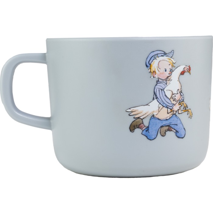Blå mugg med ett handtag och motiv från Emil i Lönneberga. Denna mugg från Rätt Start är tillverkad i RPET som är ett tåligt material.