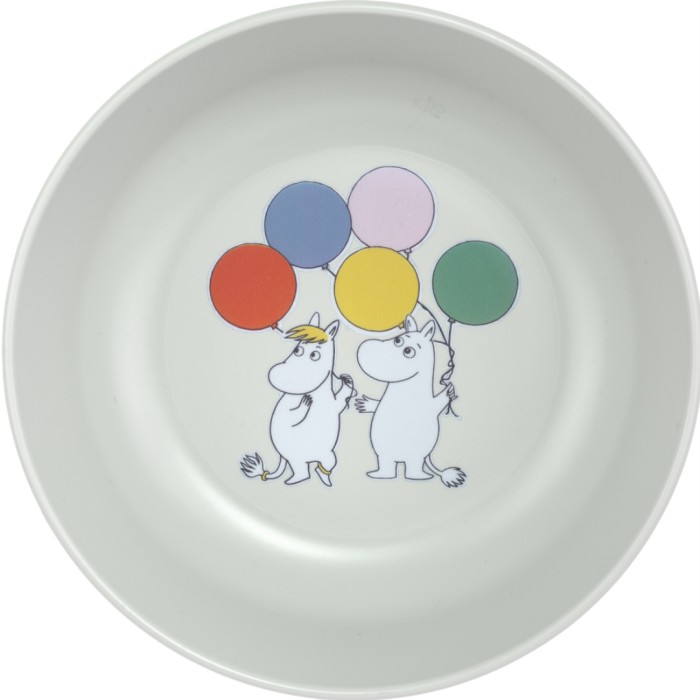 En djup skål med motiv från kollektionen Mumin Festligheter. Skålen är tillverkad i RPET som är ett tåligt material.