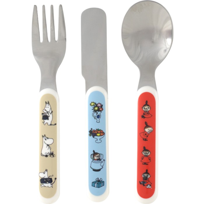 Tåliga barnbestick i tre delar med Lilla My- och Mumin-motiv. Besticken är tillverkade i ABS-plast och rostfritt stål. Kniv, gaffel och sked som passar små händer och munnar. Levereras i en fin presentkartong.
