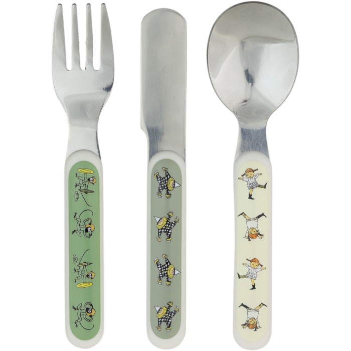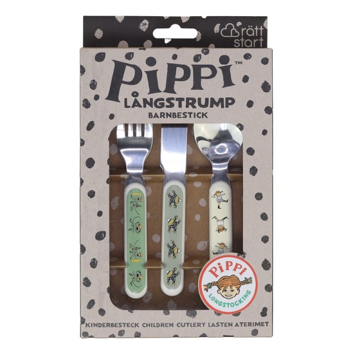 Tåliga barnbestick i tre delar med motiv från Pippi Långstrump. Besticken är tillverkade i ABS-plast och rostfritt stål. Kniv, gaffel och sked som passar små händer och munnar. Levereras i en fin presentkartong.