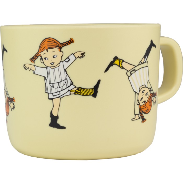 Gul mugg med ett handtag och motiv med Pippi Långstrump. Denna mugg från Rätt Start är tillverkad i RPET som är ett tåligt material.
