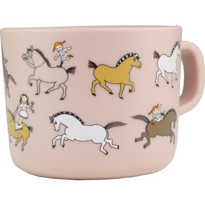Rosa mugg med ett handtag och motiv med Pippi Långstrump. Denna mugg från Rätt Start är tillverkad i RPET som är ett tåligt material.