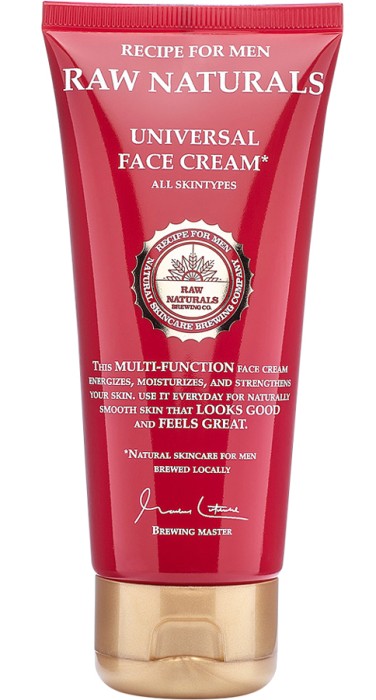 Universal Face Cream från svenska märket Raw Naturals är en multifunktionell ansiktskräm för män. Krämen ger huden en energikick samtidigt som den återfuktar och vårdar. Raw Naturals ansiktskräm innehåller återfuktande naturliga oljor från oliv och vete, energigivande xylitol och svart te, och vårdande jojoba och vitamin E.