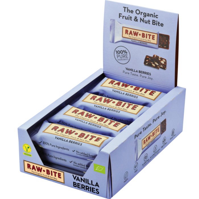 Torkade dadlar*, MANDLAR*, russin*, torkade körsbär*, torkade svarta vinbär*, CASHEWNÖTTER*, vanilj* (1%). *Ekologisk ingrediens.