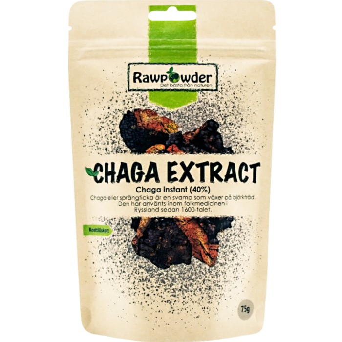 Rawpowder Chaga Instant 75 g är gjord på chaga (sprängticka), en svamp som växer på björkträd. Den är rik på mineraler, aminosyror, fytokemikalier och polysackarider. Koncentrationen av polysackarider, som är en av de aktiva ingredienserna, i chaga anges vara 40%.
