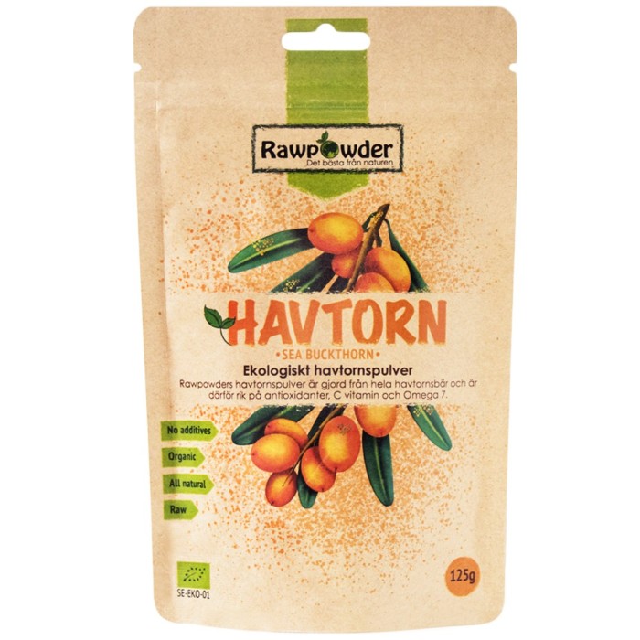 Rawpowders ekologiska havtornspulver är gjort på bär från vildväxande havtornsbuskar. Rawpowders havtornbärspulver är gjort på bär från Finland. Pulvret är gjort från hela bäret, inklusive kärnorna. Pulvret har en naturlig syrlig smak och kan blandas i t ex yoghurt eller i en smoothie.