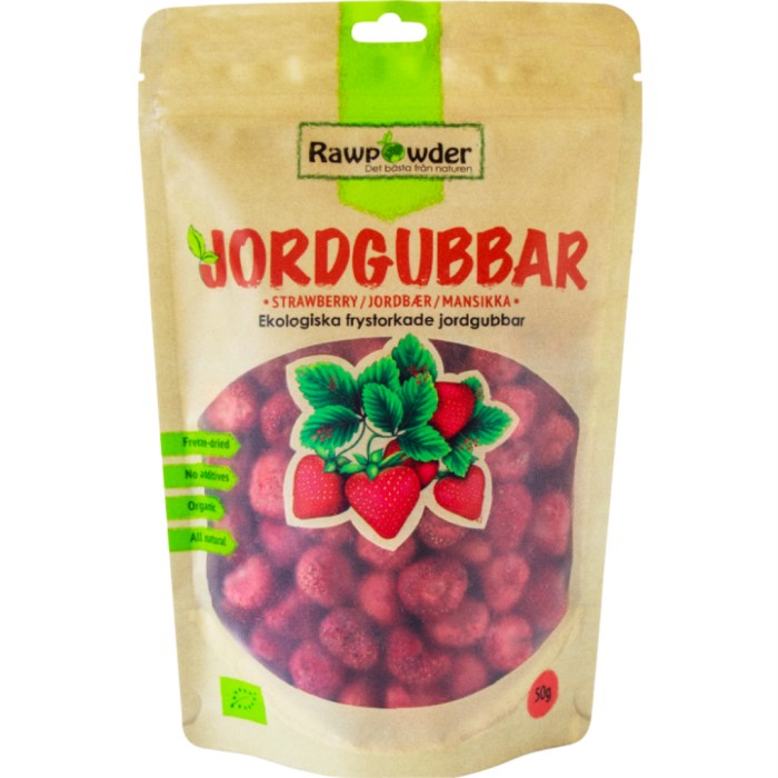 Rawpowders frystorkade jordgubbar har en rik och intensiv smak. Genom frystorkning bevarar man näringen i bären.