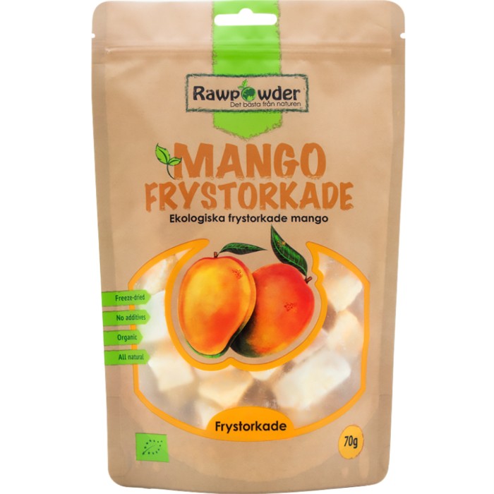 Rawpowders frystorkade mango har en rik och intensiv smak. Goda att ha på yoghurten eller att äta som snacks.