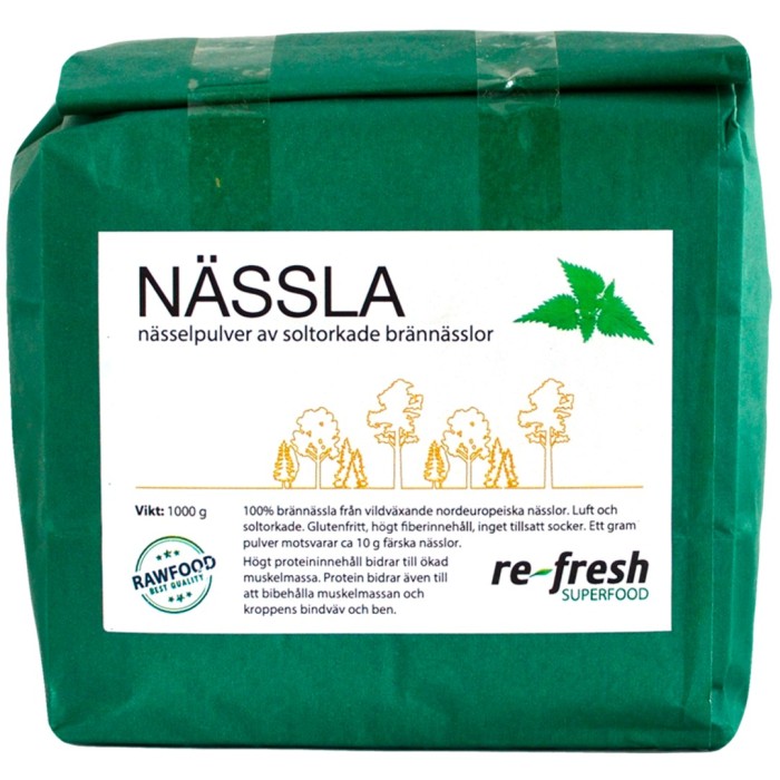 Nässelpulvret är rawfood och är ett enkelt sätt att få i sig nässlans näring. Pulvret består av finfördelade nässelblad (delvis stjälk och ev frön) från främst ungskott. Nässlorna är varsamt luft- och soltorkade (max 40 C) för att bevara alla näringsämnen.